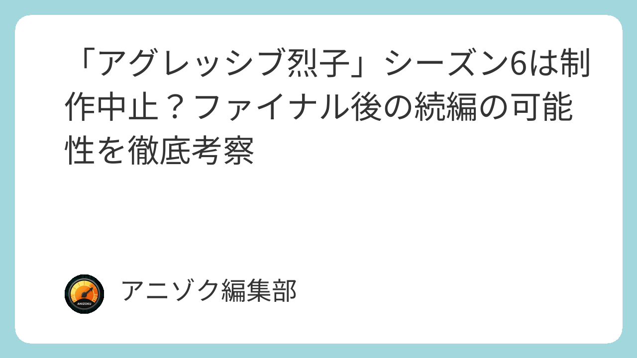 - 現状: アニメ「アグレッシブ烈子」はシーズン5で公式に完結済みであり、シーズン6の制作予定はない。