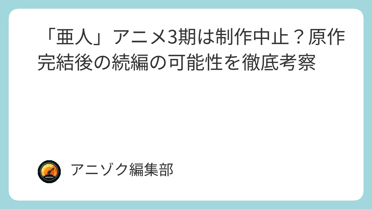 • 現状: アニメ「亜人」3期の公式な制作発表はまだなく、可能性は極めて低い。