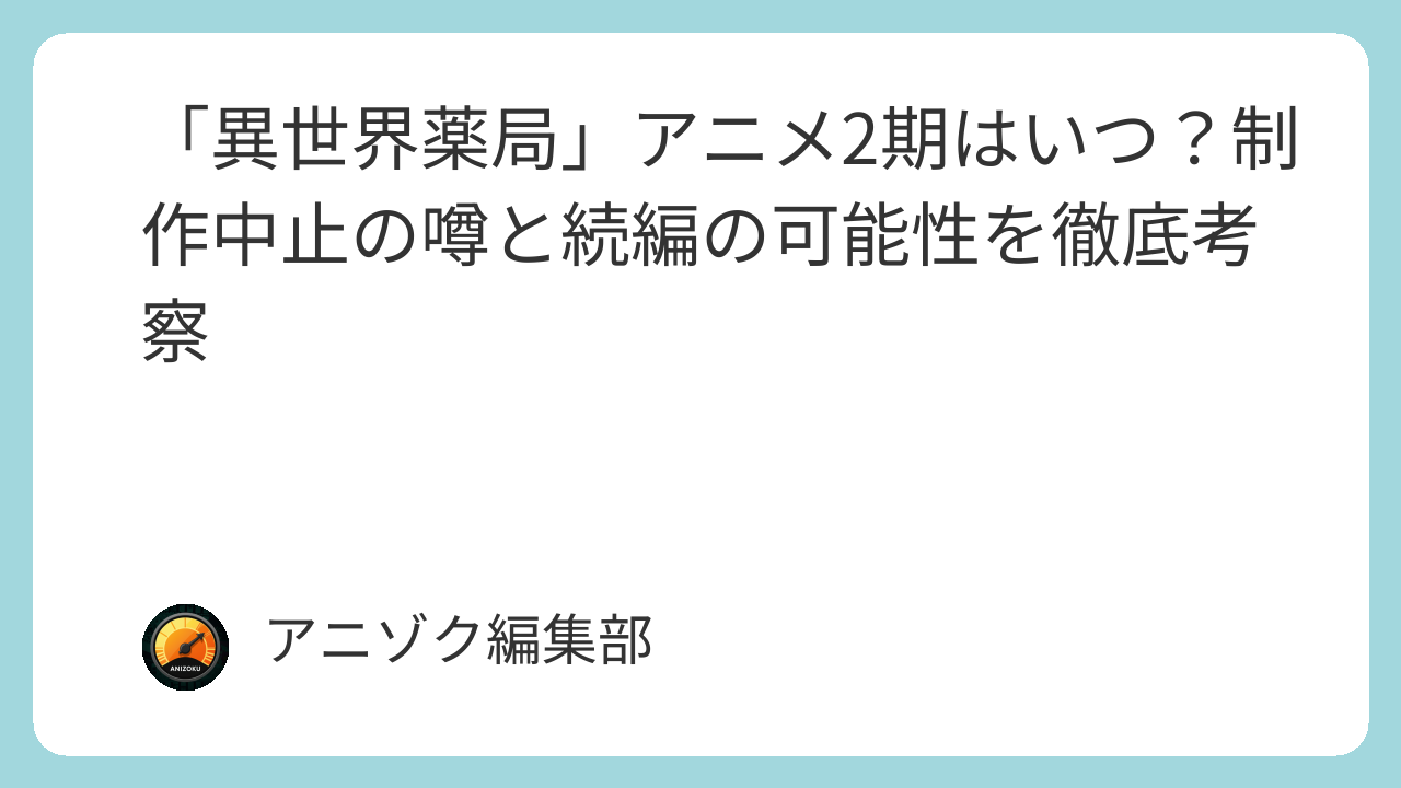 - 現状: アニメ「異世界薬局」2期の公式な制作発表はまだない。
