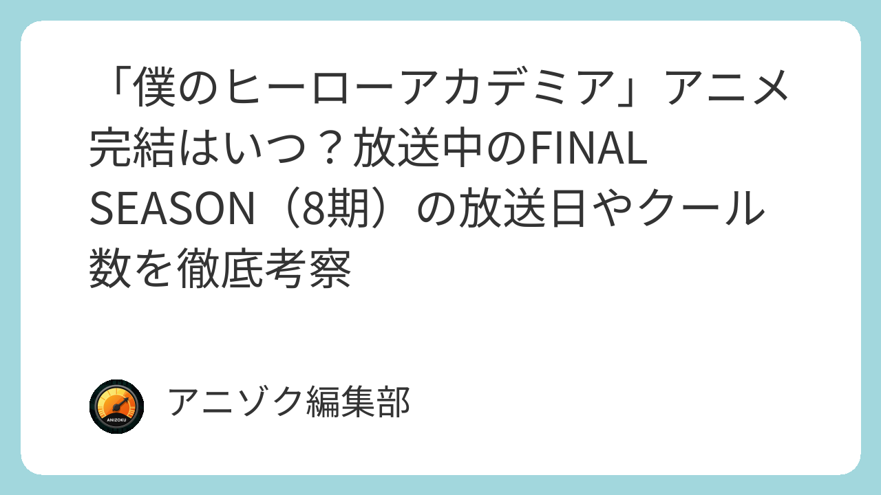 - 現状: アニメ「僕のヒーローアカデミア」の最終章『FINAL SEASON』(第8期)が2025年10月4日より絶賛放送中!