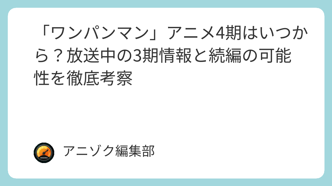 「ワンパンマン」のような世界的に注目される作品の続編を、ファンの期待に応えるクオリティで制作するためには、万全の制作体制と十分な準備期間が必要不可欠でした。6年半という時間は、そのための戦略的な期間だったと言えるでしょう。