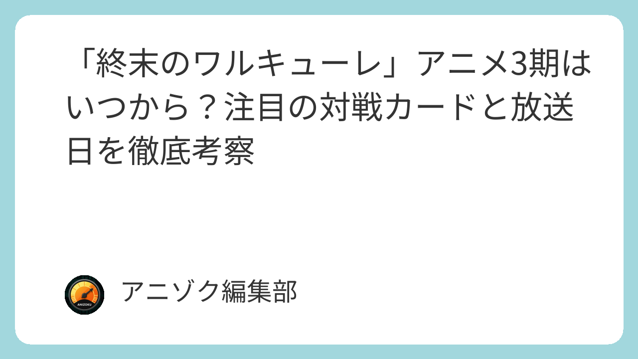- 現状: アニメ「終末のワルキューレ」3期の制作は公式に決定済み。2025年12月よりNetflixで独占配信。