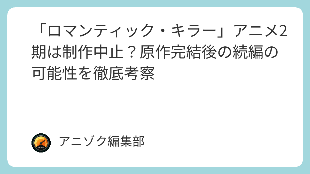 - 現状: アニメ「ロマンティック・キラー」2期の公式な制作発表はまだなく、可能性は極めて低い。