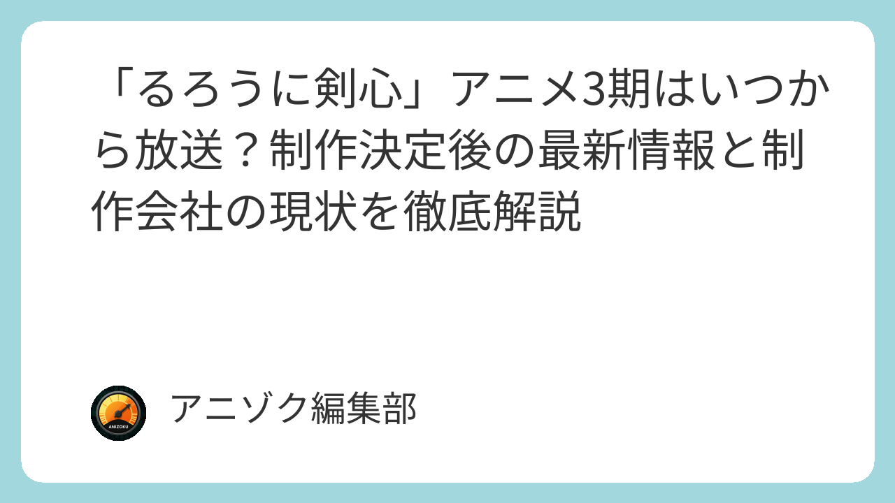- 現状: アニメ「るろうに剣心」3期の制作は公式に決定済みだが、放送時期は未定。