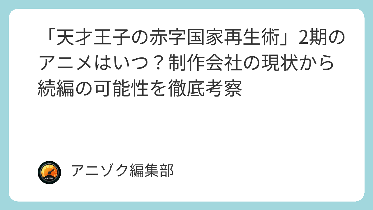 - 現状: アニメ「天才王子の赤字国家再生術」2期の公式な制作発表はまだない。