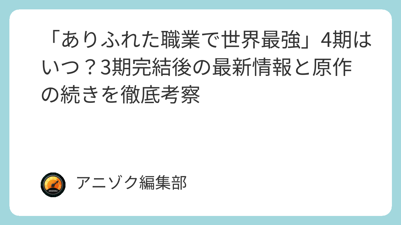 - 現状: アニメ「ありふれた職業で世界最強」4期の公式な制作発表はまだない。
