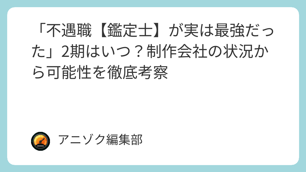 この記事では、「不遇職【鑑定士】が実は最強だった」の2期は実現するのか、その可能性をアニメ制作の鍵を握る制作会社「オクルトノボル」の最新動向を主軸に、原作の状況といった客観的なデータを基に、徹底的に考察・解説していきます。