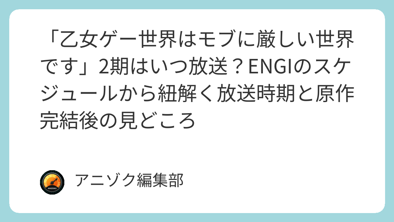 このスケジュール状況から論理的に推測すると、『乙女ゲー世界はモブに厳しい世界です』2期の放送スロットが確保できるのは、どんなに早くても2026年の秋(10月クール)、あるいは2027年にずれ込む可能性が高いと考えられます。