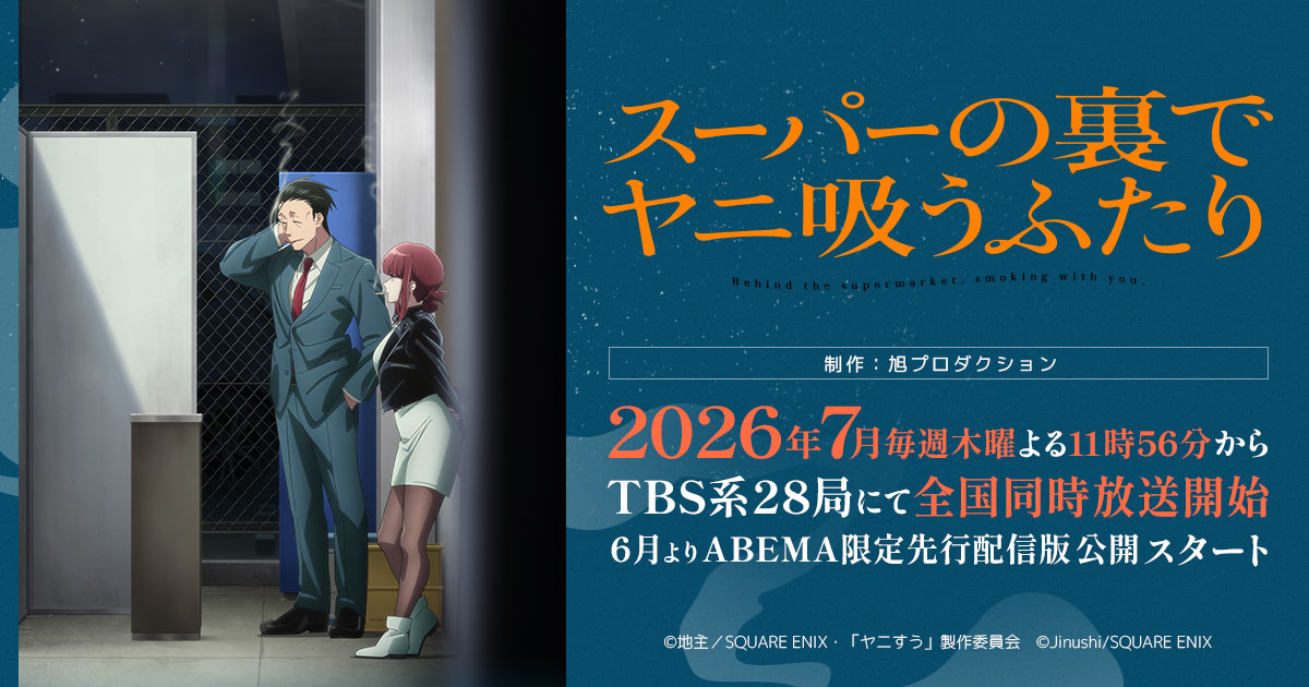 2026年7月より、ついにテレビアニメ『スーパーの裏でヤニ吸うふたり』の全国放送が決定しました。TBS系列28局にて、毎週木曜よる23時56分から放送がスタートします。さらに、地上波での放送に先駆けて、ABEMAにて同年6月より限定先行配信が開始されることが公式より発表されました。待ち焦がれた二人の時間が、いよいよ画面越しに共有されることになります。毎週木曜日の深夜、一日の終わりを告げる23時56分という放送枠は、疲れた社会人たちがホッと一息つくための時間帯として、まさに「夜の喫煙所」という本作の世界観と完璧なシンクロ率を誇っているといえます。