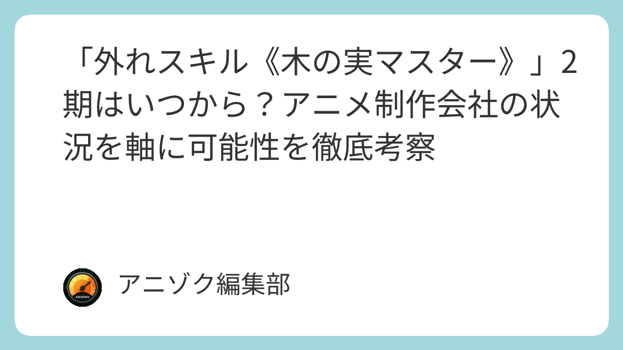 - 現状: アニメ「外れスキル《木の実マスター》」2期の公式な制作発表はまだない。